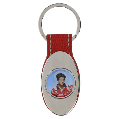 Llavero de metal cromado con imagen plastificada de San Carlo Acutis y soporte de cuero sintético rojo.