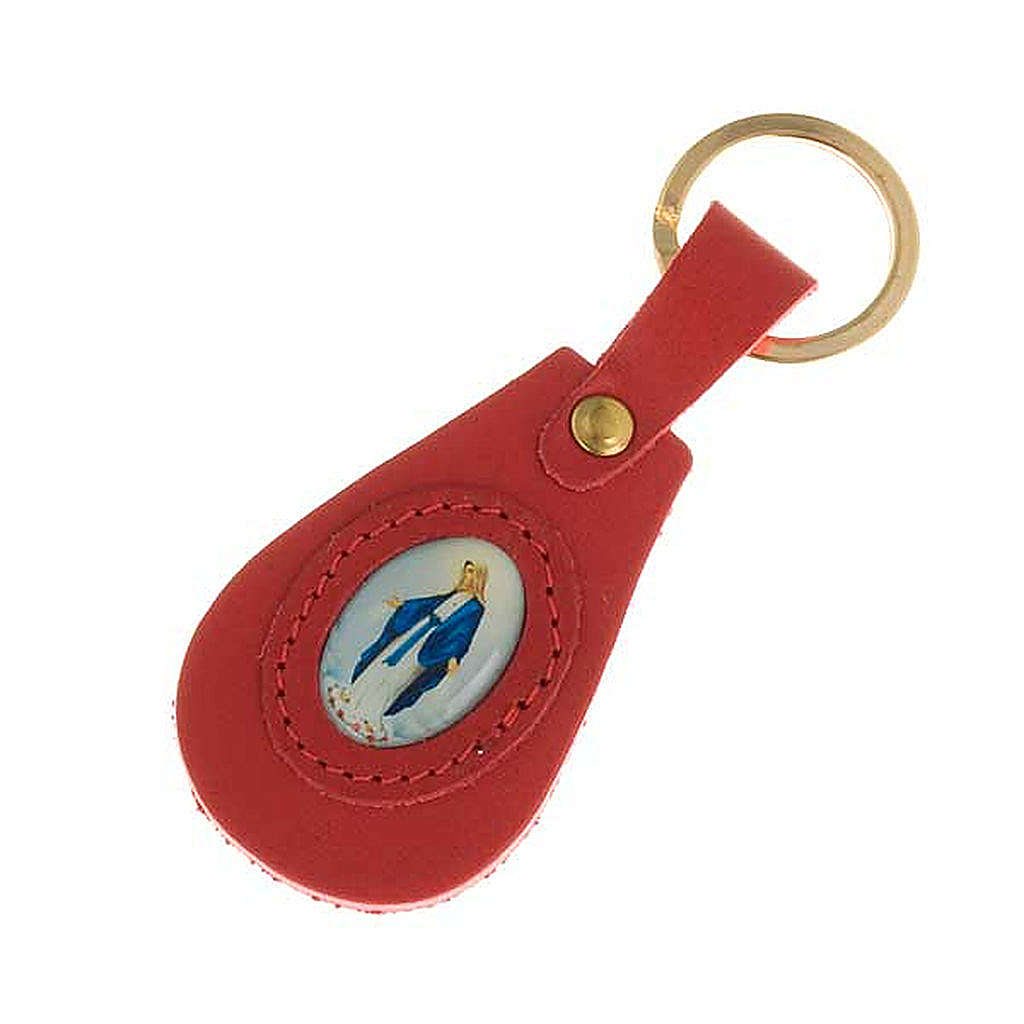 Llavero de la Virgen Milagrosa en cuero a forma oval.