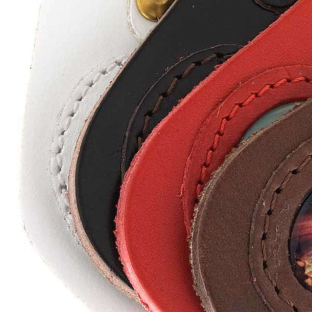 El llavero está hecho de cuero genuino, artesanía 100% italiana, en forma de flor con la Virgen Milagrosa.