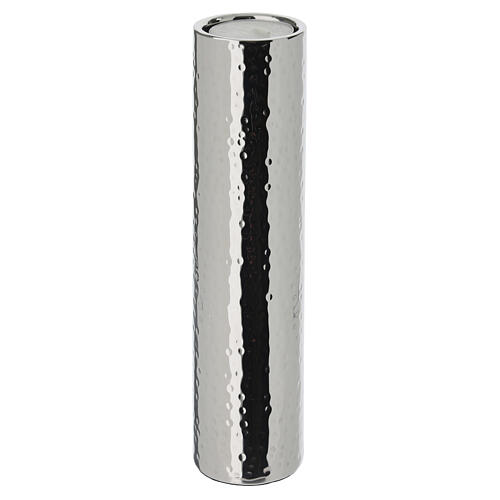 Portavela de columna de metal con superficie de efecto martillado y silueta esbelta.