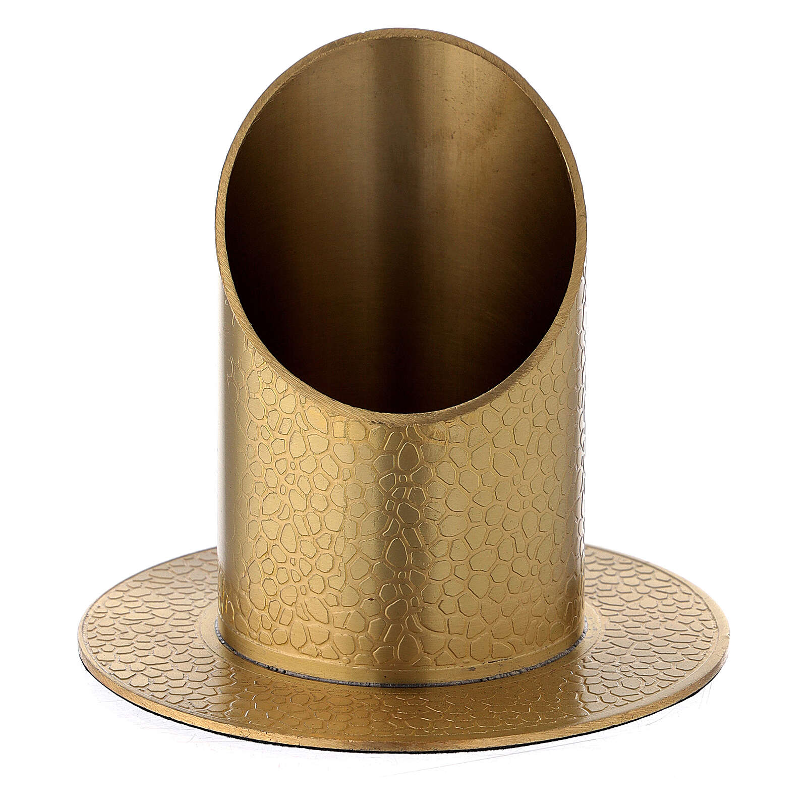 Portavela de 5 cm de diámetro de latón dorado con parte exterior decorada con efecto cuero y base con corte oblicuo.