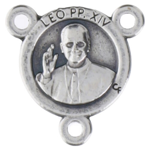Cruce redondo de 10 mm de zamak plateado con la imagen de Papa León XIV en el anverso y la Basílica de San Pedro en el reverso, diseñada para su montaje en rosarios.