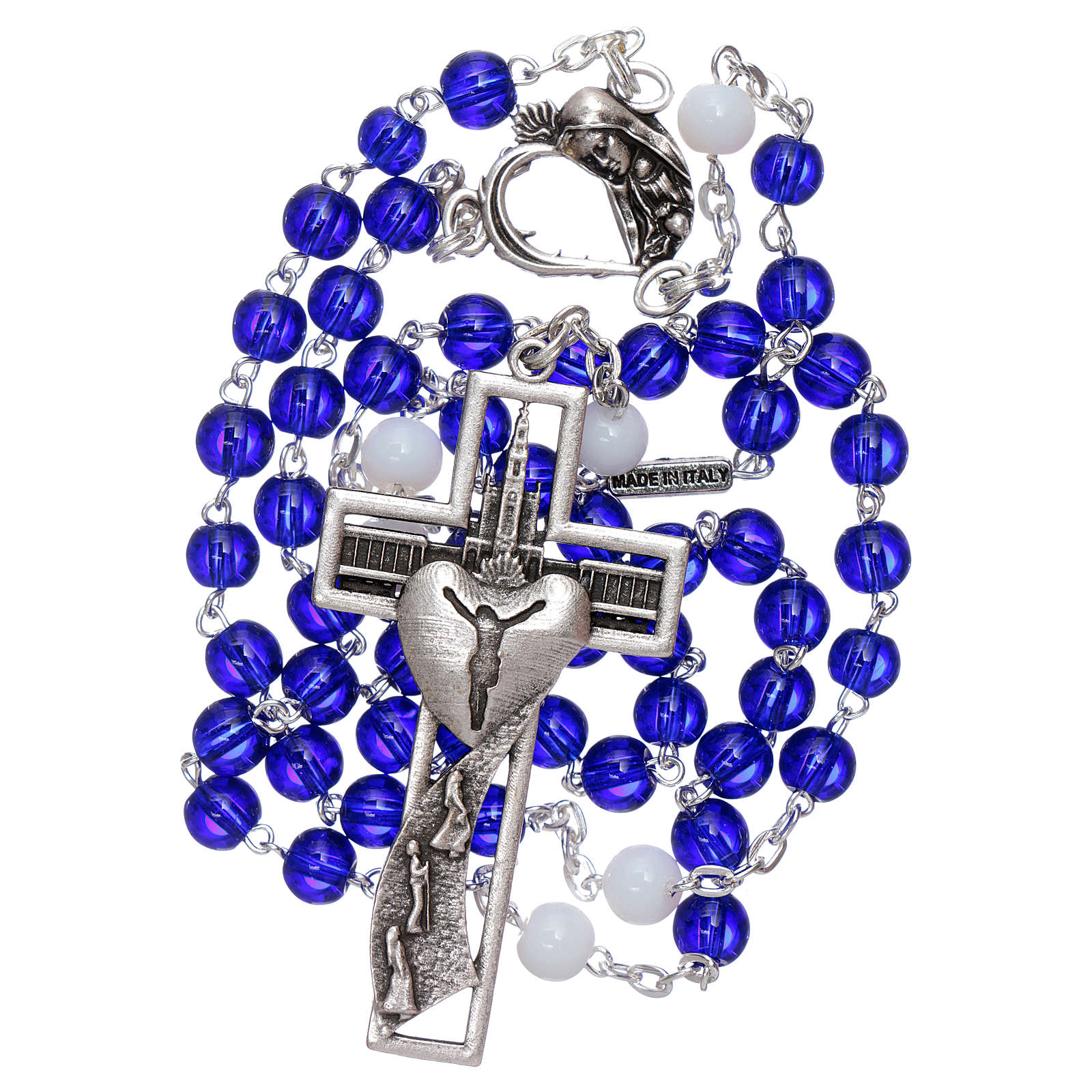 Rosario realizado por la famosa empresa italiana Ghirelli en ocasión del Centenario de las Apariciones de la Virgen en Fatima. En la pieza central hay la imagen del Inmaculado Corazón de María en relieve, oración en INGLÉS y años 1917-2017. Este rosario tiene cruz de 5,5 cm de alto y 2,9 cm de ancho. Cuentas de 6 mm de diámetro.