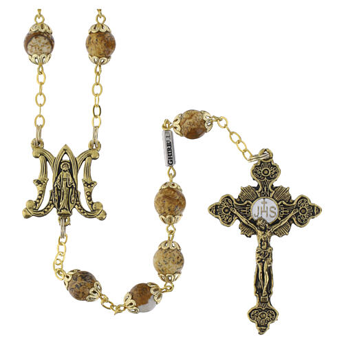 Las cuentas de color marrón, beige y ocre presentan vetas irregulares típicas del jaspe y van acompañadas de casquillas metálicas decorativas. La medalla central representa a la Virgen Milagrosa; la cruz mide 5x3 cm y muestra a Cristo en relieve con el símbolo IHS en el centro.