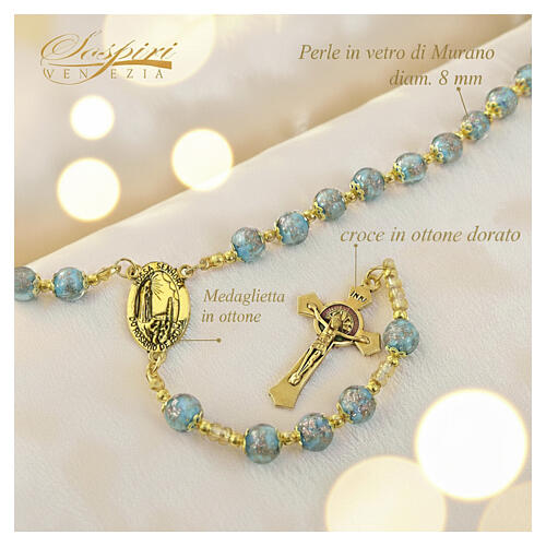 Rosario de 78 cm de circunferencia compuesto por 59 cuentas celestes de vidrio de Murano de 8 mm. Incluye una cruz dorada de San Benito y medallón central de latón dedicado a la Virgen de Fátima y al Sagrado Corazón.