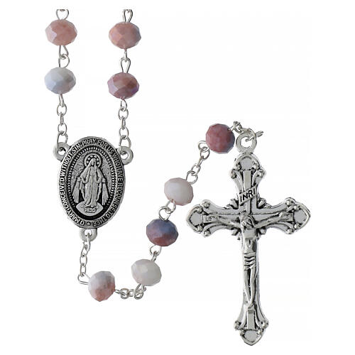 Rosario de la Virgen Milagrosa con granos de vidrio tallados de 8 mm en tonos degradados rosa y violeta (corte sun cut), unidos por una cadena metálica y con medalla ovalada central que representa a la Virgen Milagrosa.