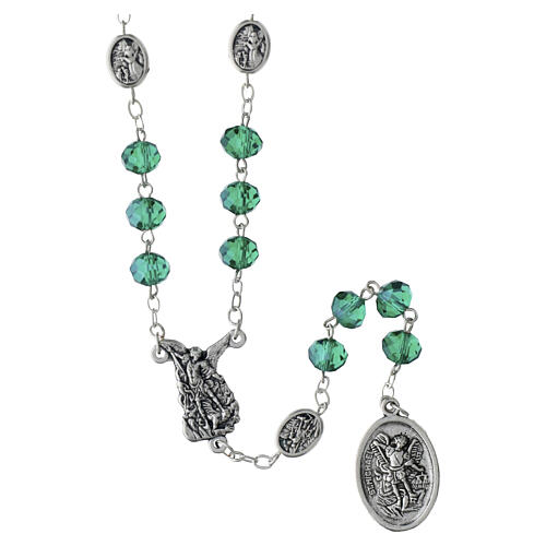 Rosario de 52 cm de circunferencia con granos de plástico de color turquesa de 5 mm de diámetro, pater de 5x5 mm con San Miguel y el Ángel de la Guarda protector de los niños, cruce de 1,5x1,3 cm y medalla colgante de 2x1,3 cm con San Miguel derrotando al demonio.Peso del rosario: 80 gr.
