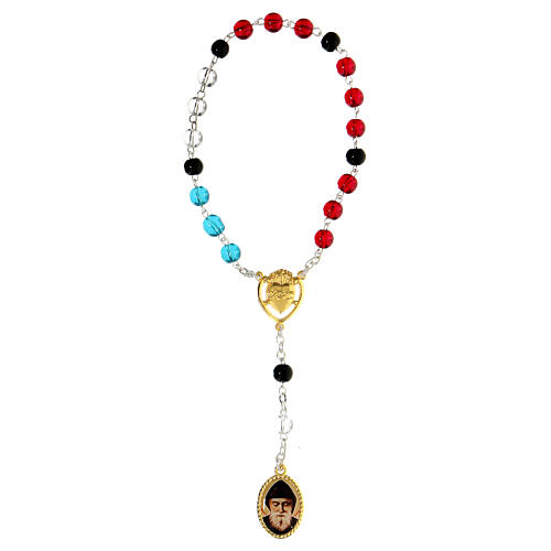 Rosario San Charbel metal granos rojos azules transparentes vidrio 5 mm