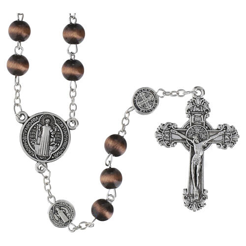 Rosario de San Benito con granos de 8 mm de material plástico con efecto ojo de tigre marrón y componentes metálicos.