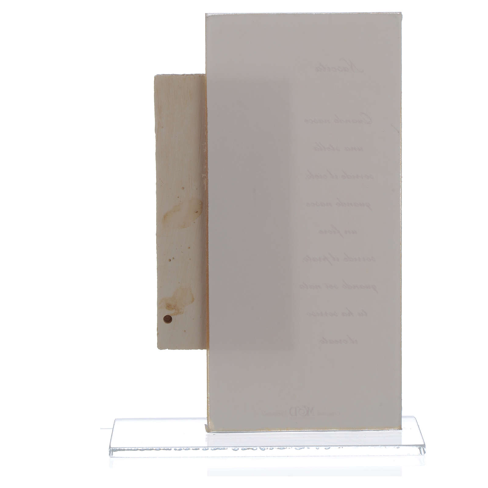 Cuadro con imagen en relieve y oración en italiano estampada sobre el vidrio.