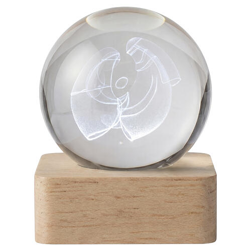 Recuerdo compuesto por una esfera de cristal de 6 cm de diámetro con base de madera de 6 x 6 cm.
