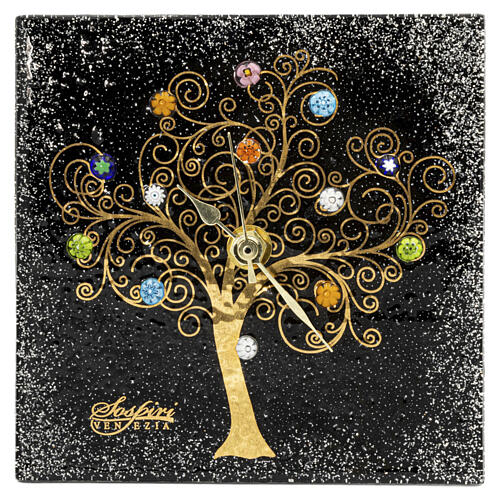 Reloj de mesa cuadrado negro de 19x19 cm con murrinas de vidrio de Murano y adorno central del Árbol de la Vida de oro puro.