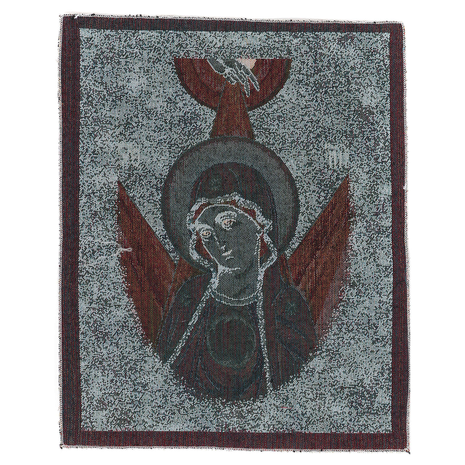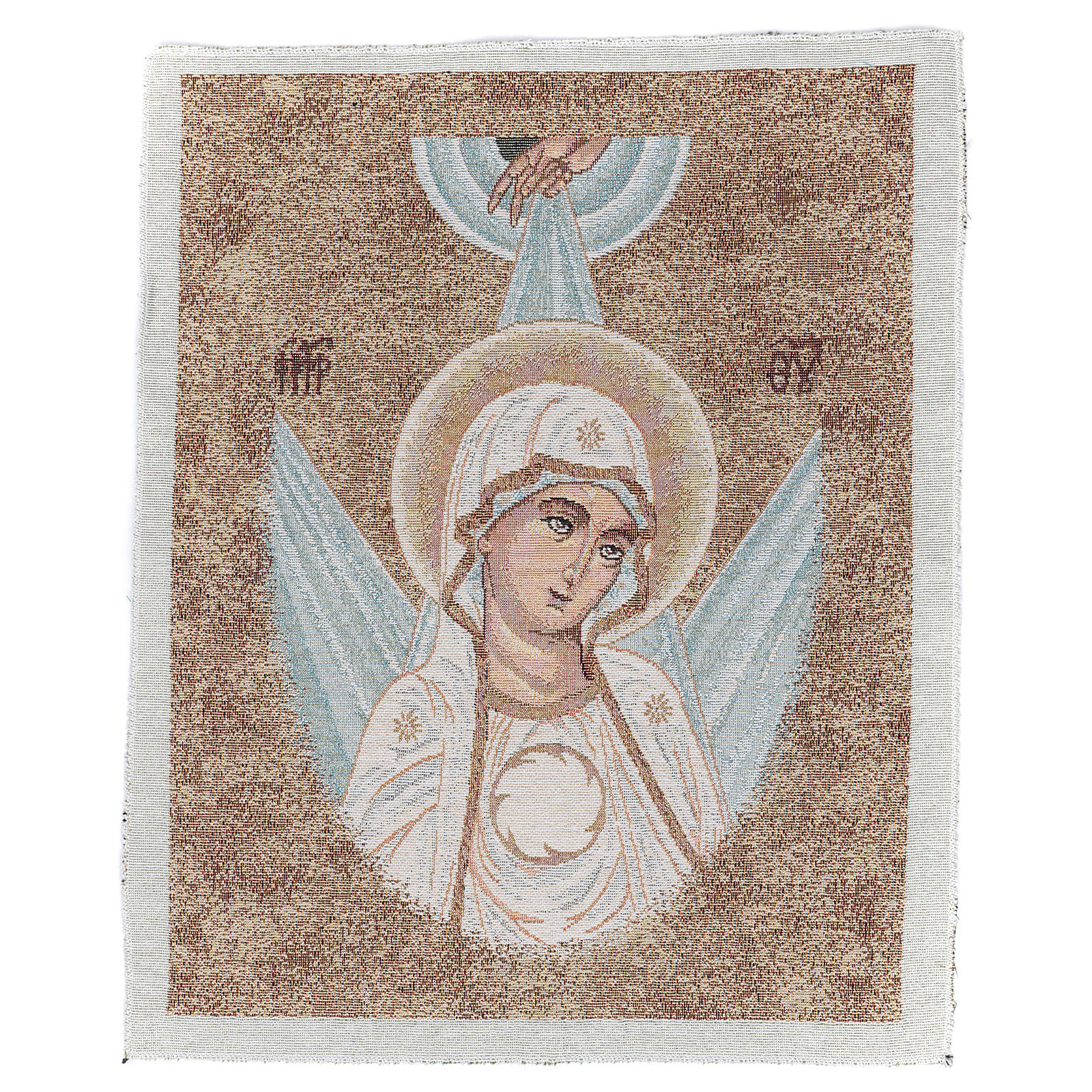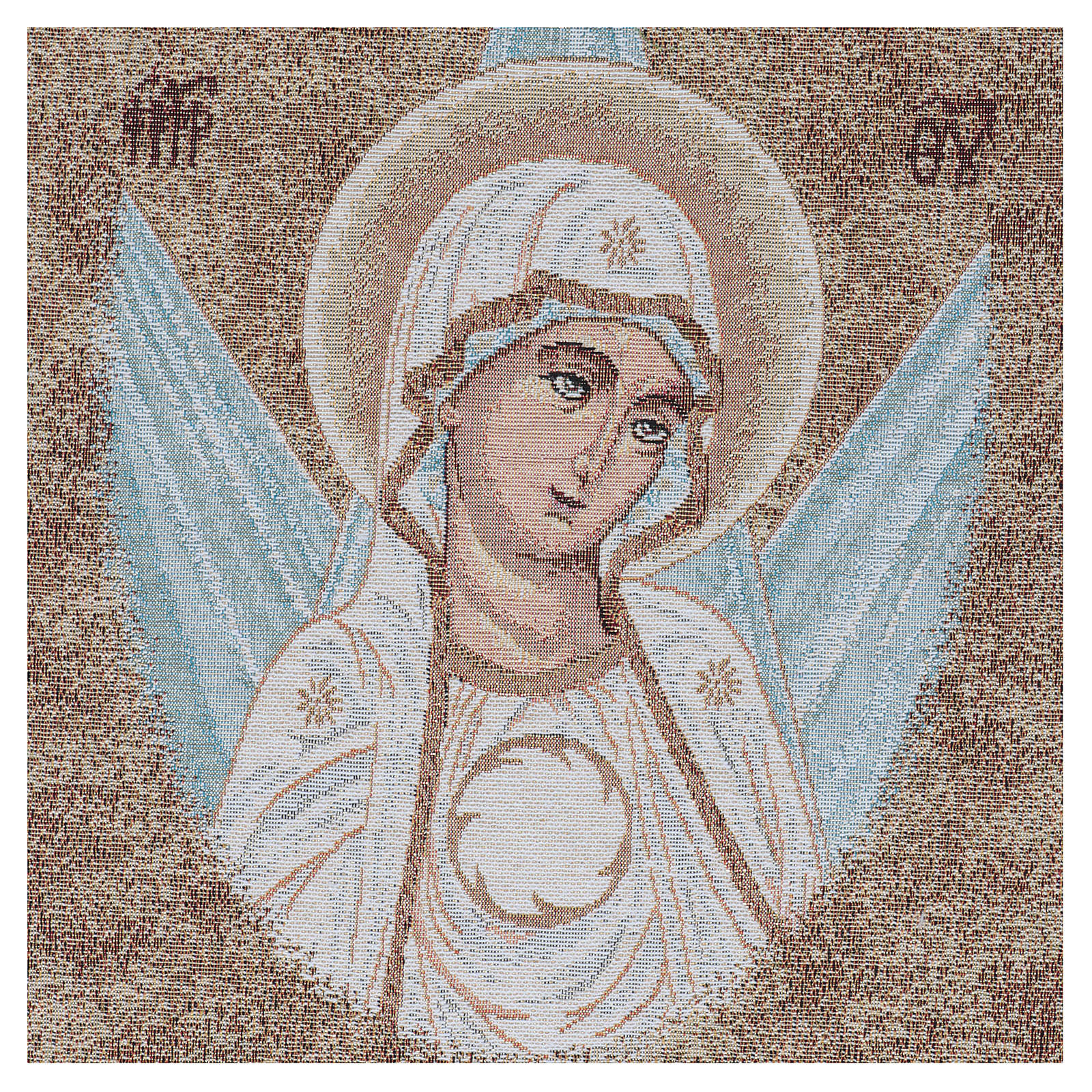 Tapiz con la cara de la Virgen en estilo bizantino y rayos a sus espaldas.
