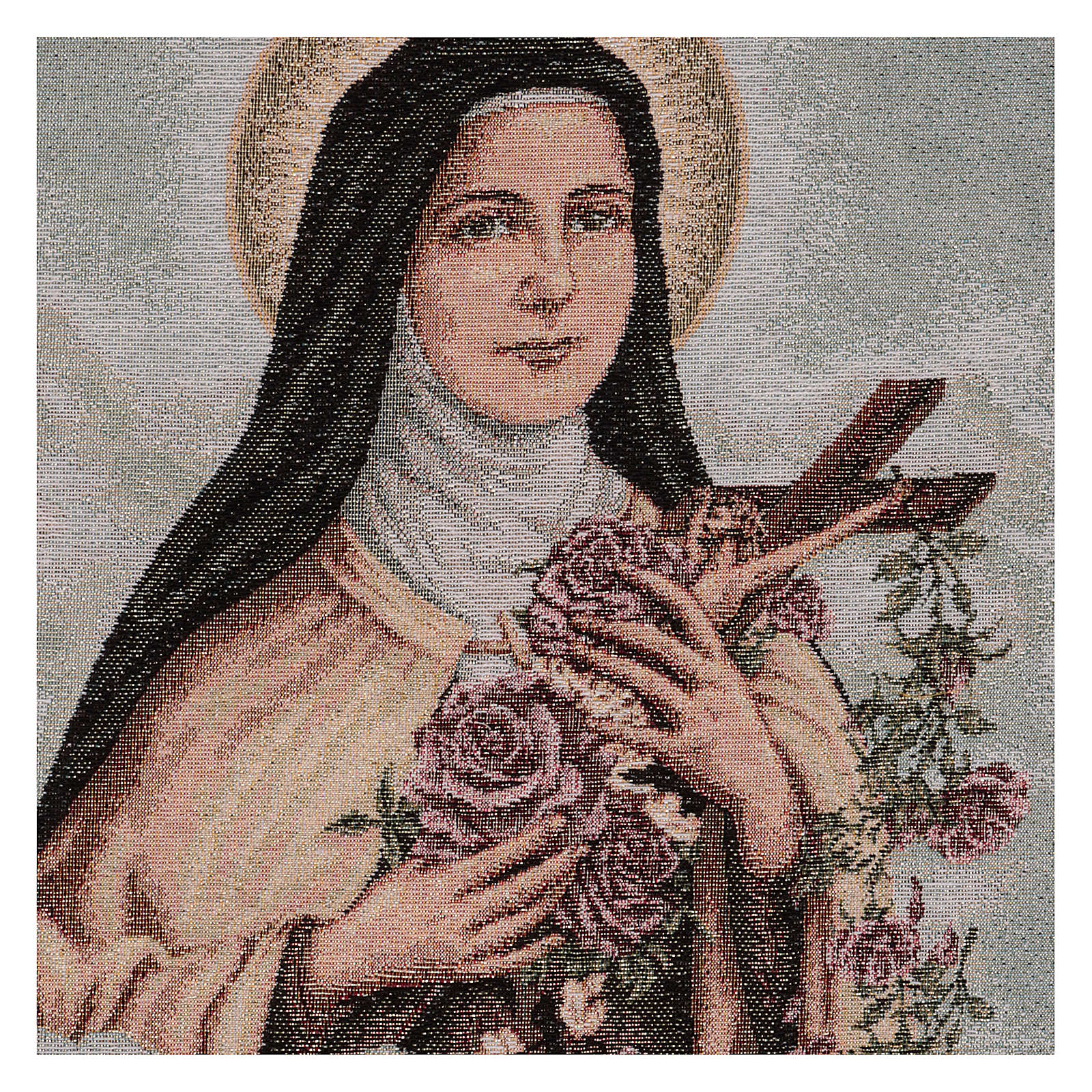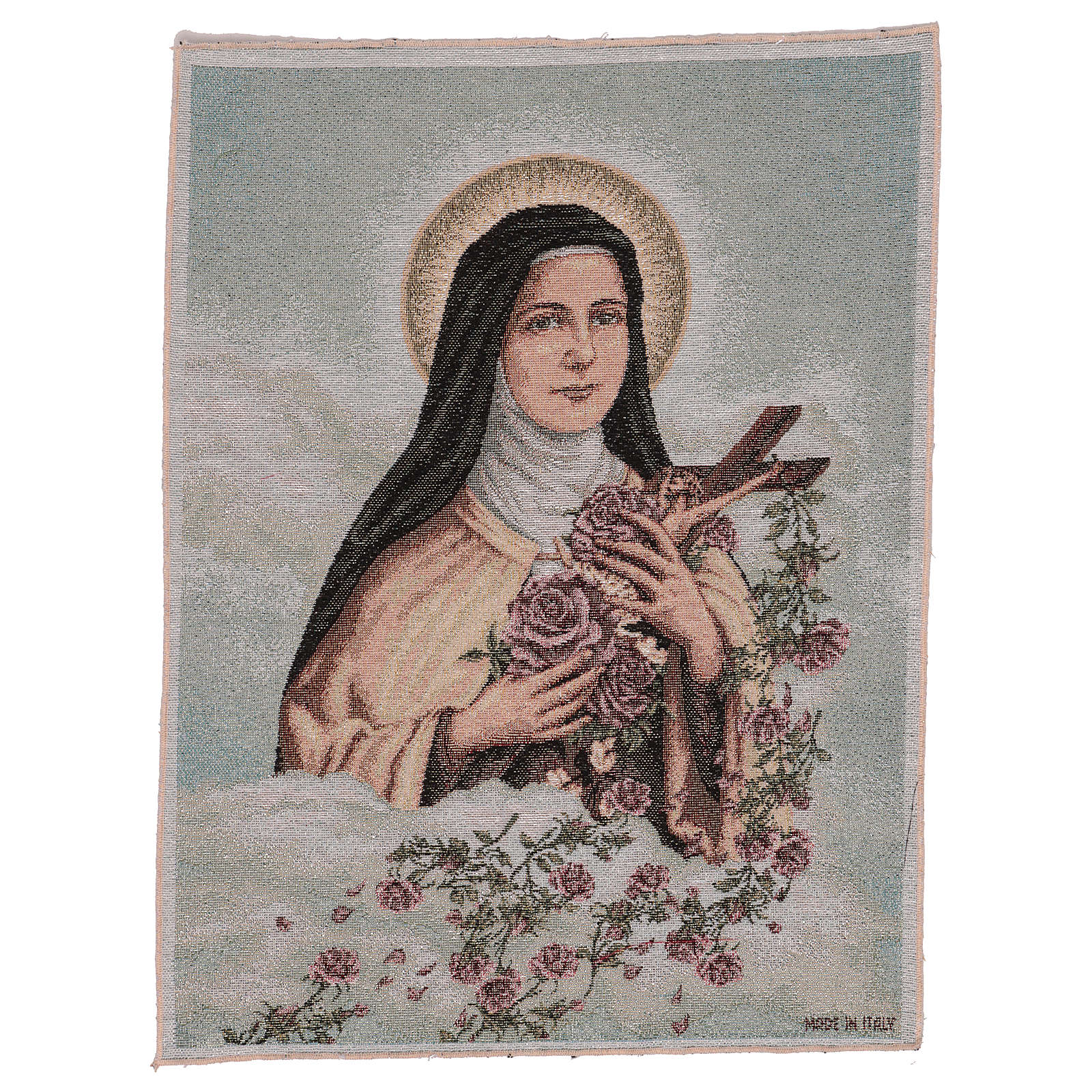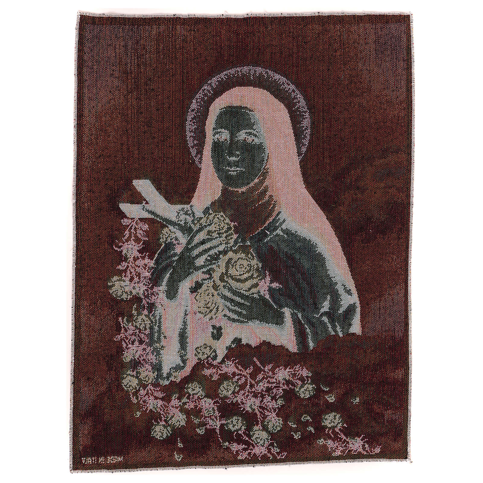 Tapiz Santa Teresa de Lisieux con fondo azul de 50x40 cm de tejido jacquard realizado en Italia y acabado a mano.
