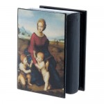 Caja laca rusa La Virgen del Belvedere, reproducción estilizada del cuadro famoso «La Virgen del Belvedere» (o Virgen del Prado), pintura al óleo sobre madera (113×88 cm), de Rafael Sanzio en 1506. La pintura original se conserva en el Kunsthistorisches Musuem de Viena.