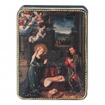 Laca rusa papel maché Nacimiento Cristo de David Fedoskino style 11×8 cm, reproducción estilizada del cuadro «El Nacimiento de Cristo» del maestro holandés Gerard David. Esta pequeña caja de papel maché fue realizada a mano siguiendo la antigua tradición rusa y procesada con la técnica de pintura sobre base preimpresa.
