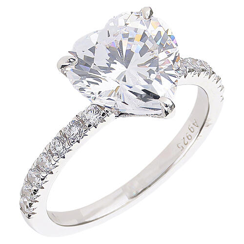 Anillo de plata 925 rodiada con zircón blanco en forma de corazón de 10 mm montado en una base de tres garras curvas y rematado con zircones redondos aplicados a lo largo del anillo.