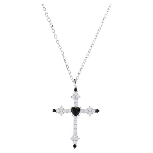 Presenta una cadena fina y una cruz colgante de plata decorada con zircones blancos y un zircón central negro en forma de corazón.
