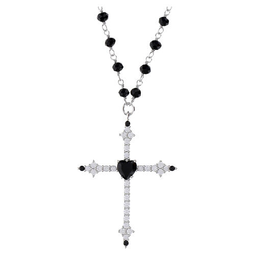 Colgante en forma de cruz de 4 x 3 cm, adornado con zircones blancos y negros en los brazos y una gran zircón negro en forma de corazón en el centro. La cadena está enriquecida con granos facetados de cristal negro de 3 mm.