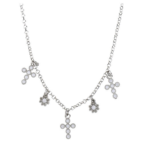 Collar de plata 925 con cadena roló y 5 chcolgantes en forma de flores y cruces con zircones blancos de 10x7 mm.