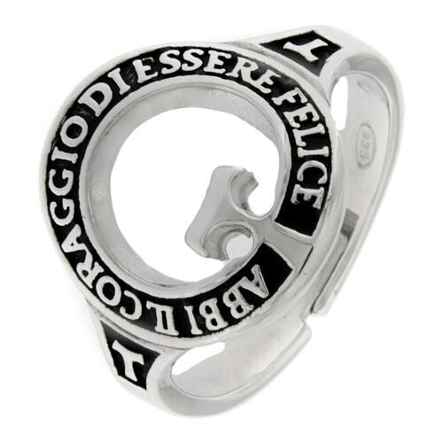 Anillo de plata 925 rodiada bruñida de la colección "Abbi il coraggio di essere felice" (Atrévete a ser feliz) dedicada a Papa Francisco.Anillo realizado completamente en Italia por los artesanos expertos de la empresa Benedictus que crea joyas que combinan fe y moda.Anillo ajustable disponible en cuatro tamaños con cofre y bolsa.