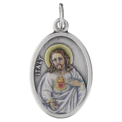 Medalla ovalada de 25x15 mm: el anverso con la Virgen plateada en relieve y el reverso con impresión esmaltada colorida de Jesús.