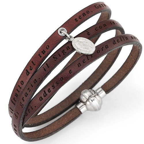 Pulsera AMEN con colgante de la Virgen y la oración del Avemaría en Italiano en cuero marrón y cierre magnético. Todas las pulsera AMEN son realizadas en Italia con acero 316L analérgico, sin níquel, sin cadmio y plomo.