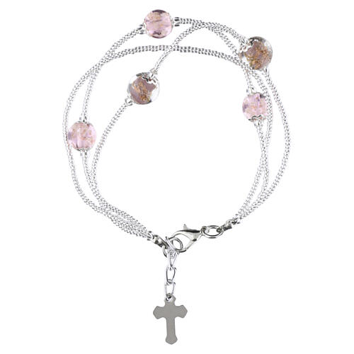 Pulsera 3 vueltas perlas 5 mm vidrio Murano acabado plateado rosa y lila