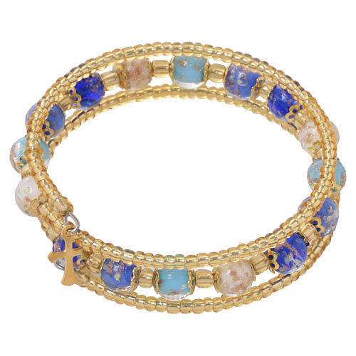 Pulsera Rezzonico con perlas de 8 mm de vidrio de Murano de color azul, celeste y blanco, con estructura elástica de muelle y cruz dorada.