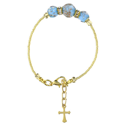 Pulsera LUCY con perlas de vidrio de Murano celeste de 10 mm, cierre y cadena de color oro y longitud inicial 16 cm, extensible hasta 20 cm.