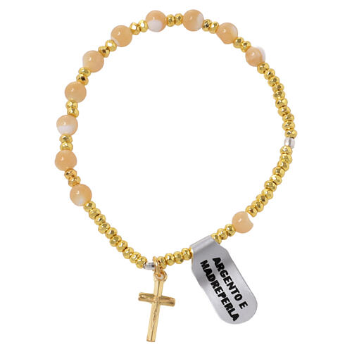 Pulsera elástica rosario con cruz de plata 925 dorada, decena de ojo de tigre y bolitas de hematites dorada.Peso de la joya: 8,2 gramos.
