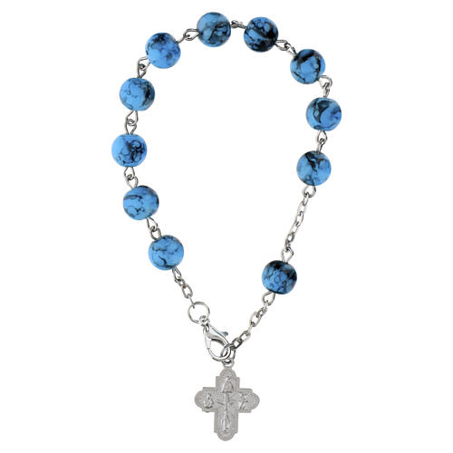 Pulsera decena con granos de 6x6 mm de vidrio maculado azul, cierre y cruz colgante de metal.
