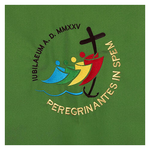 Paño de atril de 250x50 cm con logotipo oficial del Jubileo 2025 en latín bordado y coloreado.Paño de atril realizado en Italia por una sastrería especializada y disponible en los cuatro colores litúrgicos (verde, marfil, rojo y violeta). Paño de atril de tejido Vatican de poliéster resistente.