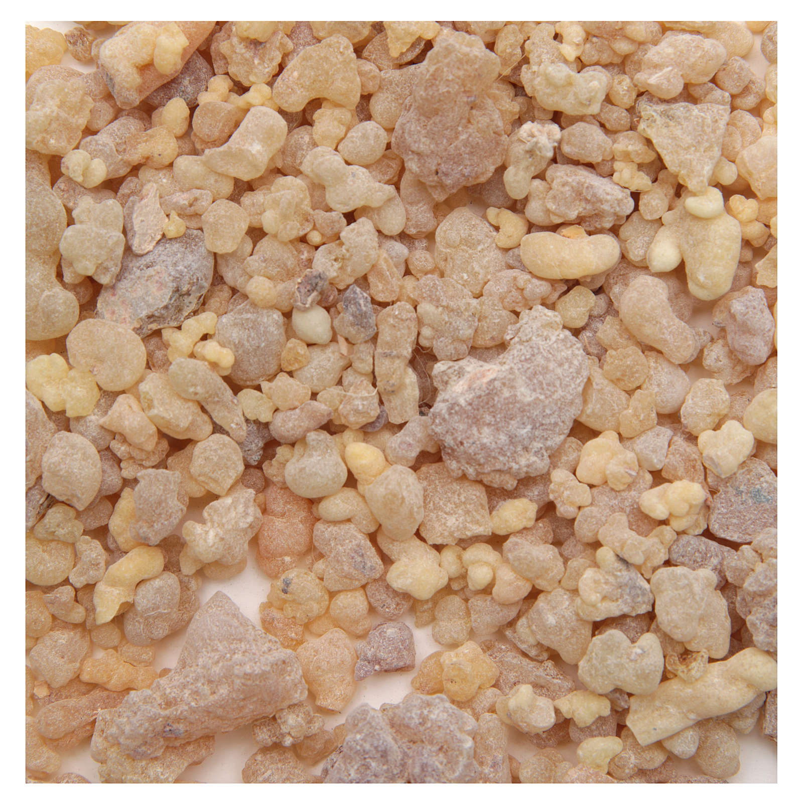 Incienso 100% natural. La denominación incienso 'White-drop' se refiere al tamaño de los granos del incienso (grande). Tal granulometría confiere un aspecto estético mejor al produce menos polvo y quema más lentamente (menos humo). Muy usado como signo en las celebraciones litúrgicas.