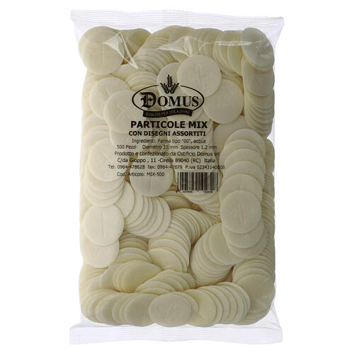 Hostias para la celebración eucarística con símbolos litúrgicos variados, elaboradas con pan ázimo de trigo (harina tipo 00) destinadas a la liturgia.