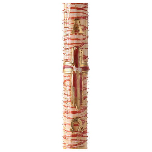Cirio Pascual de 100% cera de parafina de alta calidad de 120 cm de altura y 8 cm de diámetro realizado en Italia con materiales muy resistentes a temperaturas de verano y pintado por artistas muy expertos. Cirio Pascual con imagen en relieve de una cruz estilizada de tres colores, cordero, y letras Alfa y Omega.