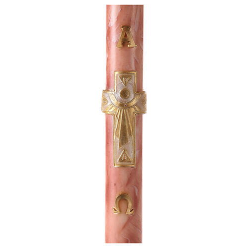 Cirio Pascual de 100% cera de parafina de alta calidad de 120 cm de altura y 8 cm de diámetro realizado en Italia con materiales muy resistentes a temperaturas de verano y pintado por artistas muy expertos. Cirio Pascual con cruz dorada, letras Alfa y Omega y fondo veteado rosa.