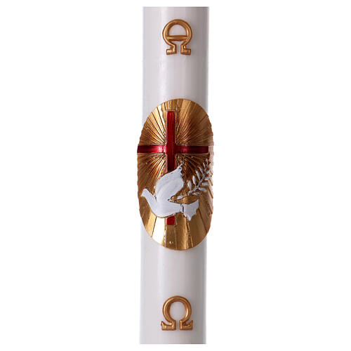 Cirio pascual blanco con bajorrelieve con la Cruz roja, la Paloma, Alfa y Omega CON REFUERZO DE METAL.