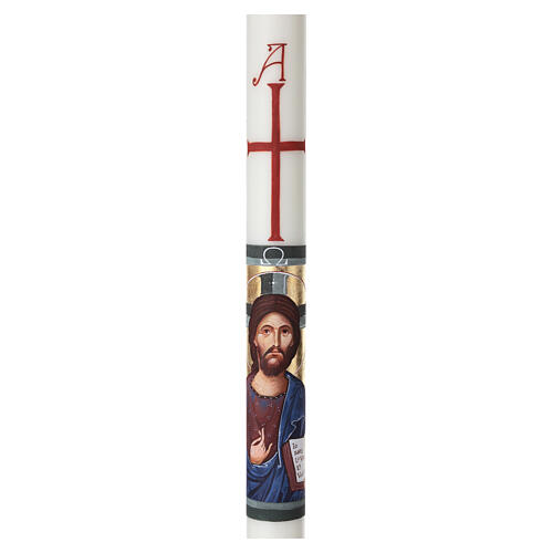 Círio pascual de cera blanca decorado con el icono de Ivan Polverari pintado a mano.