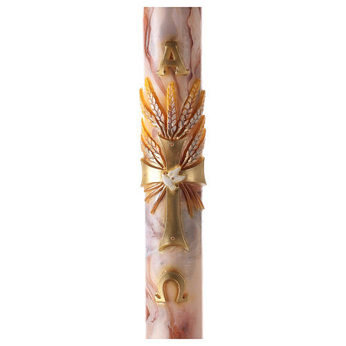 Cirio Pascual de 100% cera de parafina de alta calidad de 120 cm de altura y 8 cm de diámetro realizado en Italia con materiales muy resistentes a temperaturas de verano y pintado a mano por artistas muy expertos. Cirio Pascual con cruz dorada rodeada por espigas rojas y doradas y fondo veteado blanco-naranja.