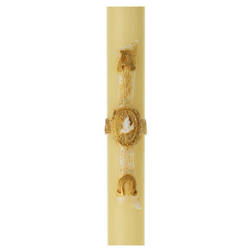 Cirio pascual de 120x8 cm de parafina refinada con aplicación en relieve de la Paloma del Espíritu Santo y rayos metálicos dorados.