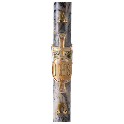Cirio Pascual de 100% cera de parafina de alta calidad de 120 cm de altura y 8 cm de diámetro realizado en Italia con materiales muy resistentes a temperaturas de verano y pintado a mano por artistas muy expertos. Cirio Pascual con cruz en relieve, letras JHS y fondo veteado blanco.