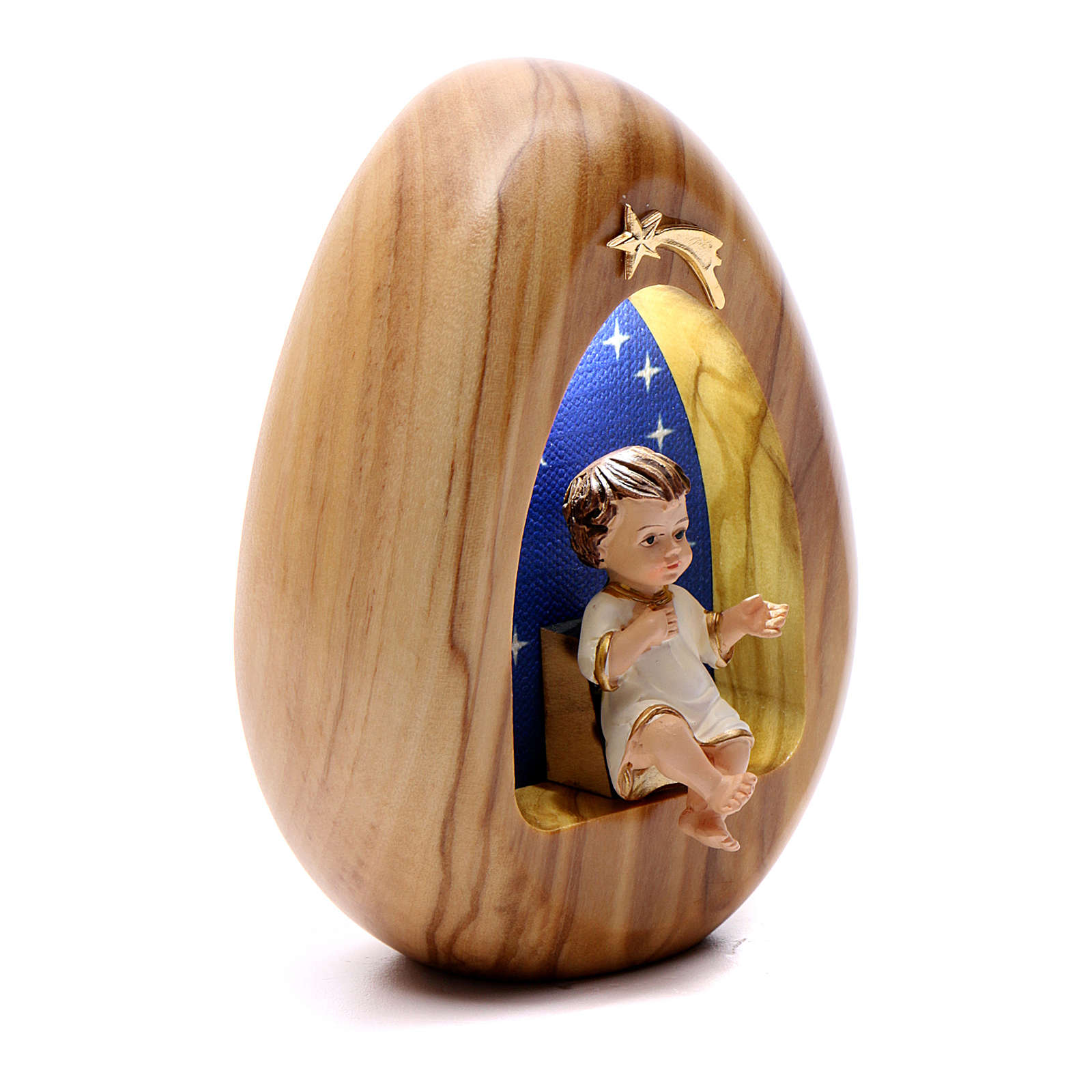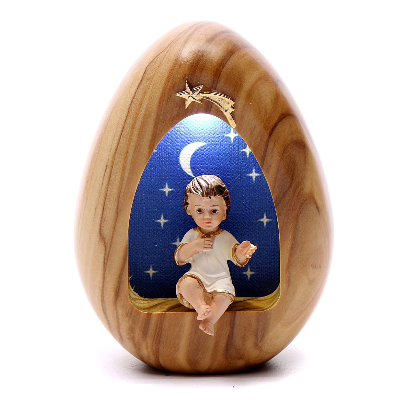 Lamparilla ovalada de madera clara de olivo con estatua del Niño Jesús de resina coloreada en la parte interior y estrella cometa de plata dorada.