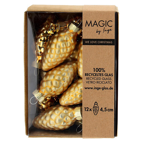 12 bolas en forma de piña de vidrio dorado (6 opacas y 6 lúcidas) de 4,5 cm.