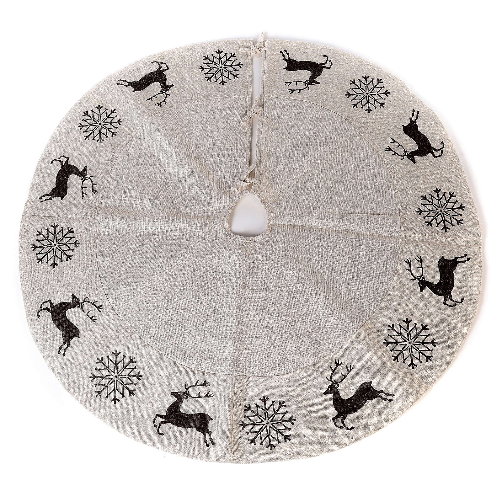 Falda cubre base con ciervos y copos de nieve bordados con máquina y detalles realizados a mano, ideal como decoración rústica de campo.