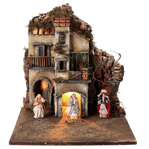 Belén napolitano iluminado módulo 3/6 de 35x35x37 cm, ideal para figuras de 8 cm y realizado íntegramente a mano en Nápoles, cuna de la tradición del belén.