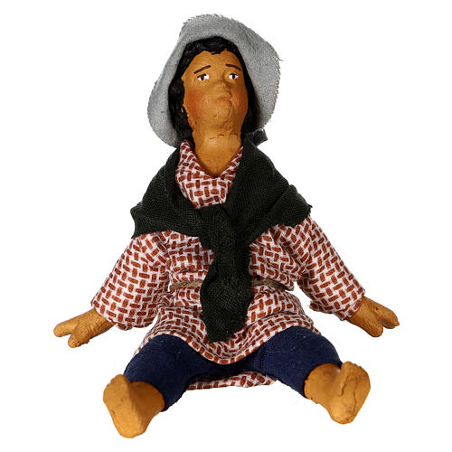 Niño sentado de 15 cm de terracota con vestidos de tela desecada, realizado a mano en Nápoles, cuna del belén artesanal.