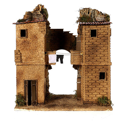 Escena de corcho de un pequeño pueblo napolitano: dos casas de ladrillo enfrentadas con balcones simétricos. Entre los balcones hay un tendedero con ropa; el hilo se pone en movimiento al conectar la clavija de 220 V (plug-and-play) de 2 polos incluida.