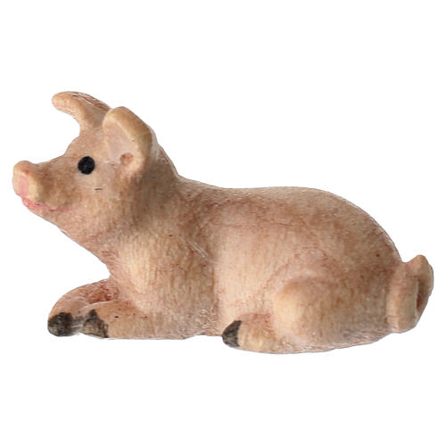 Cerdito tumbado de madera tallada y pintada a mano con métodos tradicionales por artesanos expertos de la Val Gardena para belén Kostner de 9,5 cm de altura media (la altura media es la altura de una figura humana de pie); la altura real de la figura es en proporción.