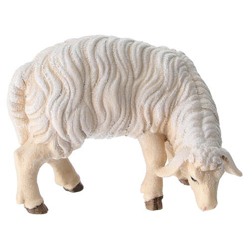 Oveja que come con la cabeza hacia derecha de madera pintada y tallada a mano en Italia por artesanos de la Val Gardena para belén Kostner de 9,5 cm de altura media (la altura media es la altura de una figura humana de pie); la altura real de la figura es en proporción.